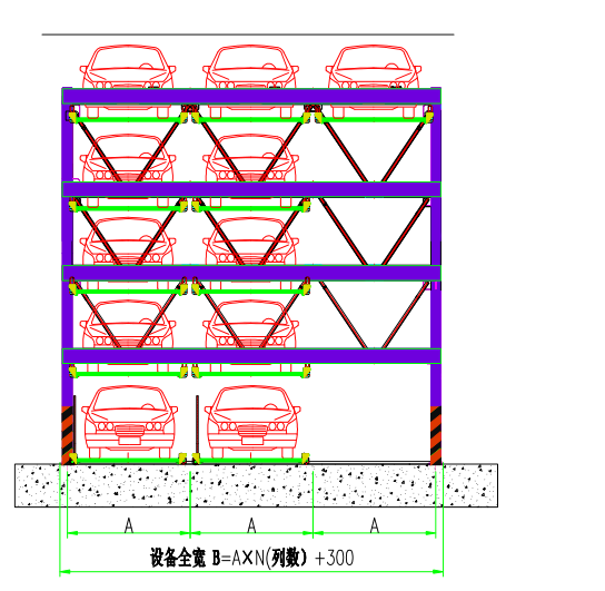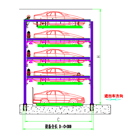 五层升降横移 运行原理 该设备的顶层载车板可上下升降;二、三、四层载车板既可升降,又可横移;底层载车板只做横移;二、三、四层和底层都有一个空位,可以通过横移载车板变换空位,使空位正上方的载车