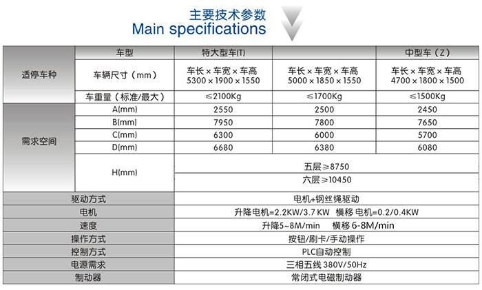 该设备的顶层载车板可上下升降;二、三、四层载车板既可升降,又可横移;底层载车板只做横移;二、三、四层和底层都有一个空位,可以通过横移载车板变换空位,使空位正上方的载车板下降到底层。底层载车板上的汽车可直接出车,完成存取过程。 特点 ●对有限的停车空间,可倍数停放车辆,可节省大量空间。 ●PLC可编程工程控制器控制,操作简单,存取方便。按钮、触摸屏、IC卡可任选。 ●升降驱动系统为钢丝绳四点吊挂式,运行平稳可靠,保证车辆升降安全。 ●设有防坠落装置,使用安全可靠,避免发生坠落事故。 ●光电检测,控制车辆规格及停放位置,使车辆有序停放。 ●光电安全检测,人员误入运行自动停止,确保车库的安全性。 ●设有急停按钮,非常情况下急停,避免发生意外事故。 ●装上常闭式电磁制动器,断电时可自动急停,确保车辆更安全。