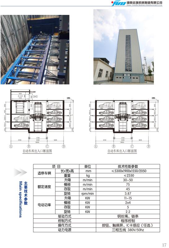 运行原理 采用巷道堆垛机将搬运机器上的车辆水平垂直移动到存车位,通过存取机构存取车辆。出入口通常设置垂直升降机,这种车库自动化程度很高,且全部封闭式建造,车辆安全性好。该车库类型主要适用于大型密集式存车